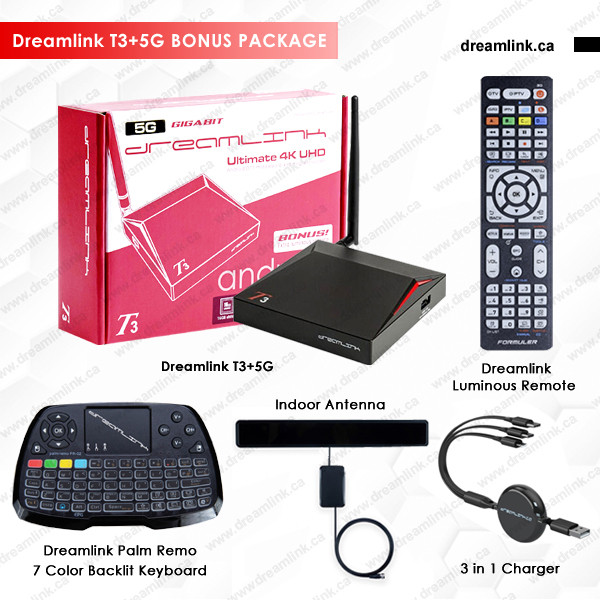 Dreamlink T3+5G with Free Gifts Indoor Antenna + Dreamlink 7 Color Backlit Mini Keyboard + 3 in 1 Charger + Luminous Remote